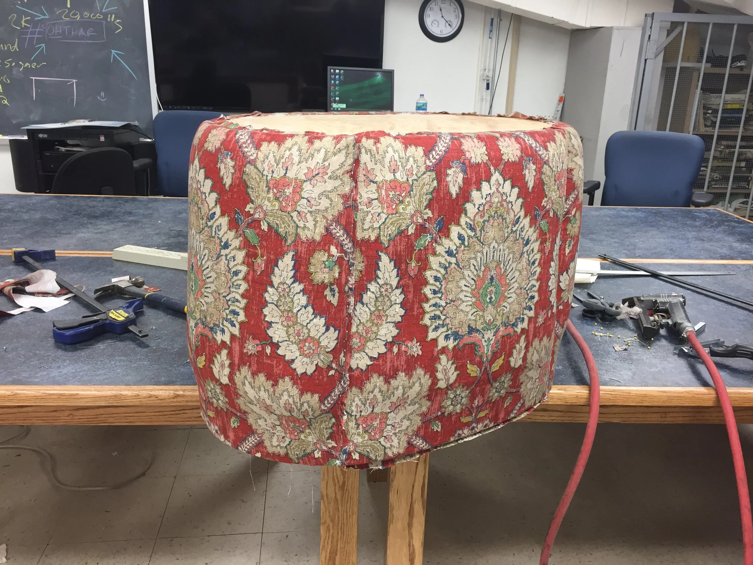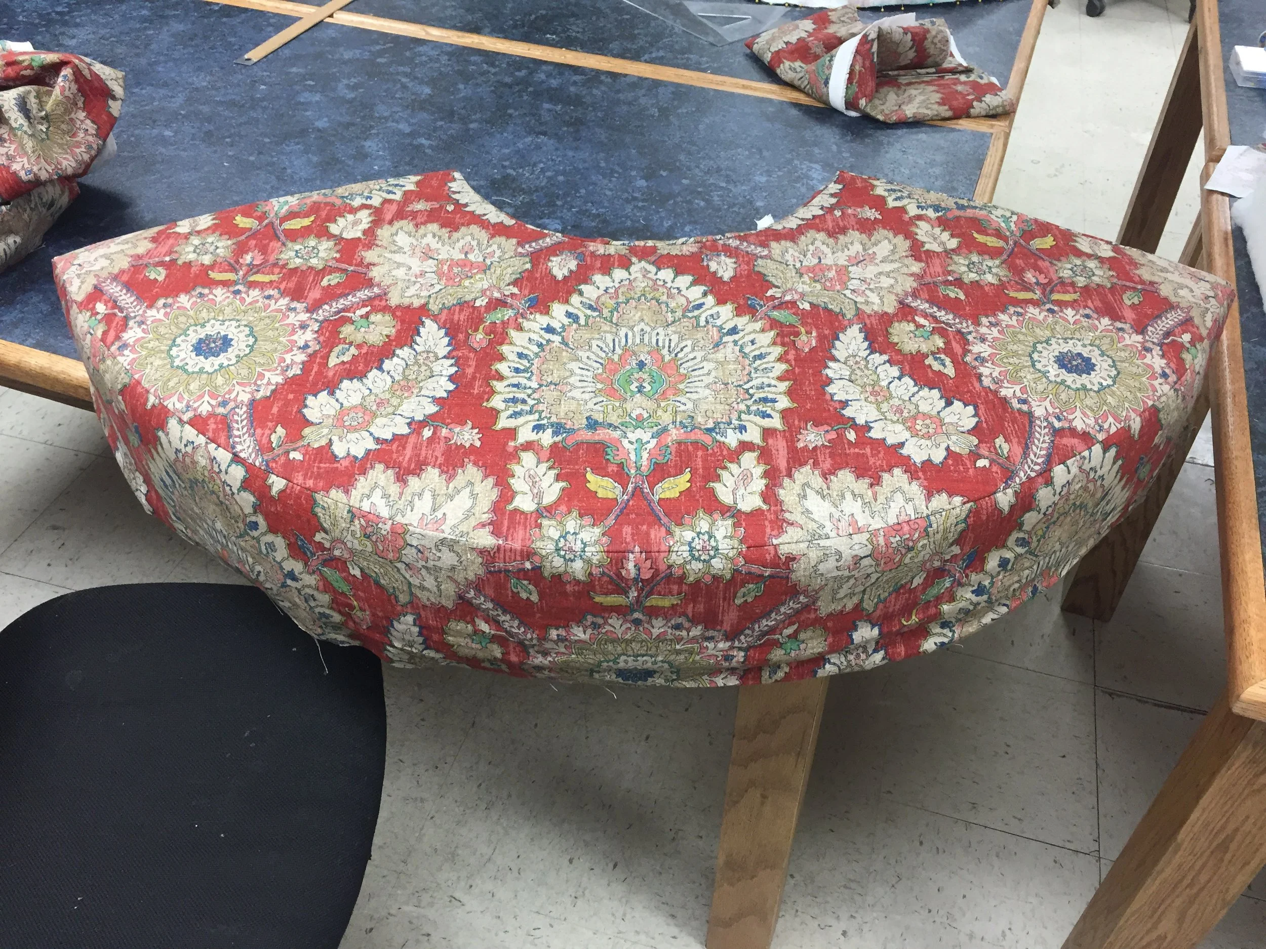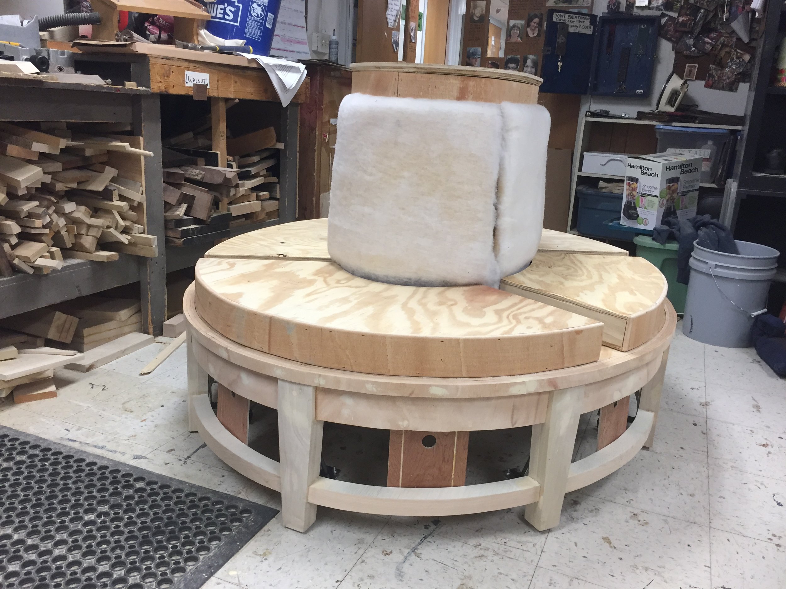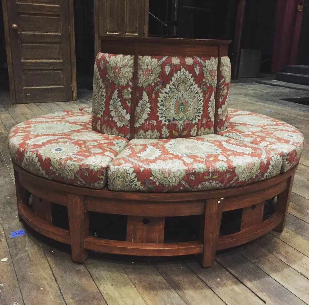 This pouffe needed to be no more than four feet wide, roll without obvious wheels or brakes, and be danced upon. It was also an unusual shape – oval instead of circular. I created hand-drafted scale drawings of the piece in top and front view, then scaled those to make patterns for the block cushions and base. The base layer was of a 3/4 ply ring topped with a solid 1/2 ply lid, sheathed and detailed in bendy ply. The legs were poplar laid up, shaped and notched with the bandsaw before being attached. The bottom ring was not structural, but simply laminated plywood cut to match the top oval and then cut to fit with the coordinating notches on the legs. For each leg I custom fabricated a metal bracket with an attached wheel, while the center support had a triple swivel caster attached to ensure direct connection to the ground at the weight-bearing point. The top piece I created to be detachable, with supports where I knew the upholstery would need to eventually be. In collaboration with our scenic designer and props supervisor we decided that if we used four inch foam for the seats, the soft “squish” of the cushion would create instability as well as make the step to the top for the actor too tall to do safely. Because of this, I built the seats as separate 1/2 ply “boxes” that fit the curves of both the exterior and interior ovals and then covered them with 1” foam and batting to create an illusion of softness. Each upholstery piece I created and pattern matched to all of the upholstery fabric at center.